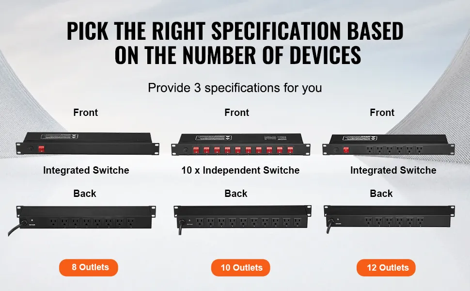 12 tomas de corriente convenientes: las 12 tomas de corriente NEMA 5-15P de la PDU pueden alimentar varios dispositivos. El interruptor integrado le permite administrar la energía de cada toma de corriente con solo un toque.