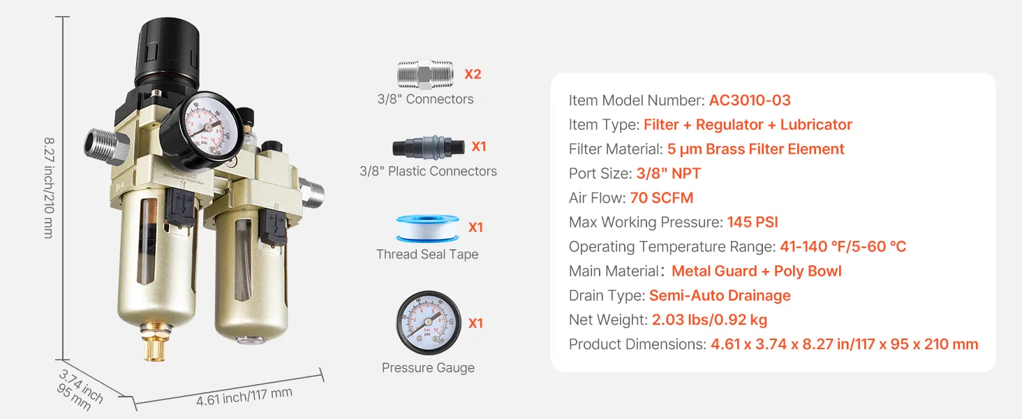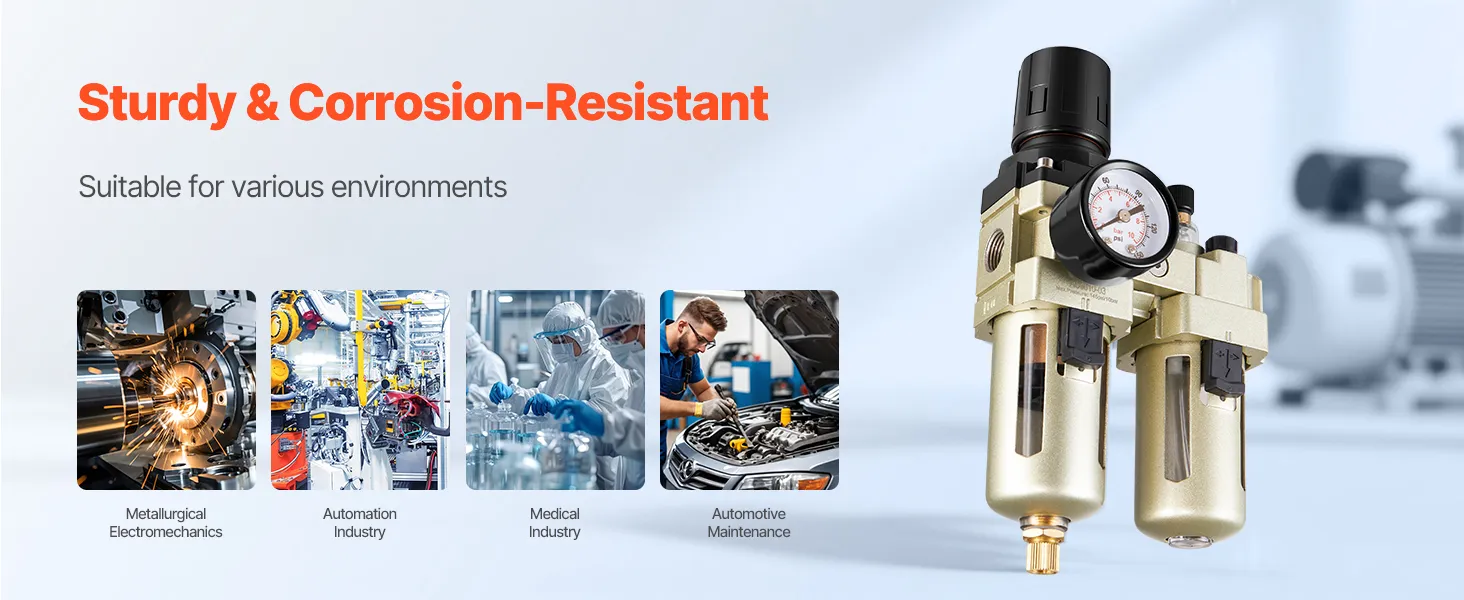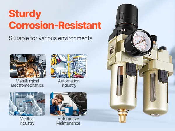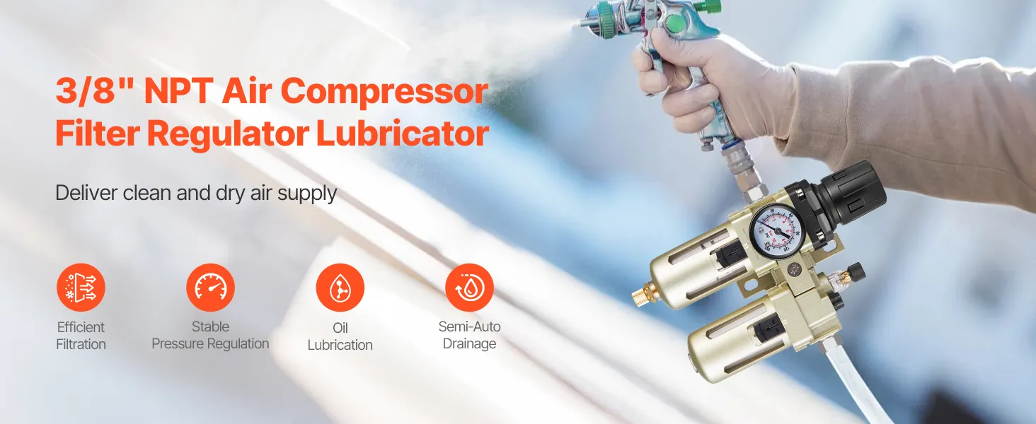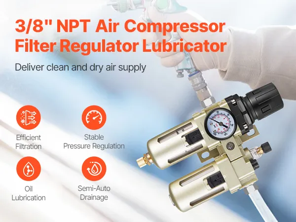 Suministre aire comprimido limpio y seco con el filtro regulador lubricador para compresor de aire VEVOR de 3/8" NPT. Combina filtración precisa, regulación estable de la presión y lubricación con aceite en una sola unidad. Con una precisión de filtración de 5 µm, elimina eficazmente la humedad, las impurezas y las partículas del aire.