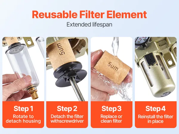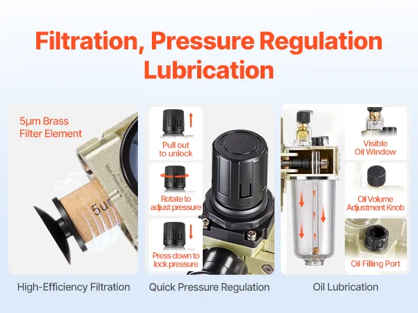 Alta configuración: Equipado con un filtro de latón de 5 µm para eliminar eficientemente la humedad, impurezas y partículas; perilla de regulación de presión para un fácil ajuste; el puerto de lubricación y la ventana de aceite visible proporcionan una lubricación conveniente (presión máxima de trabajo: 145 PSI)
