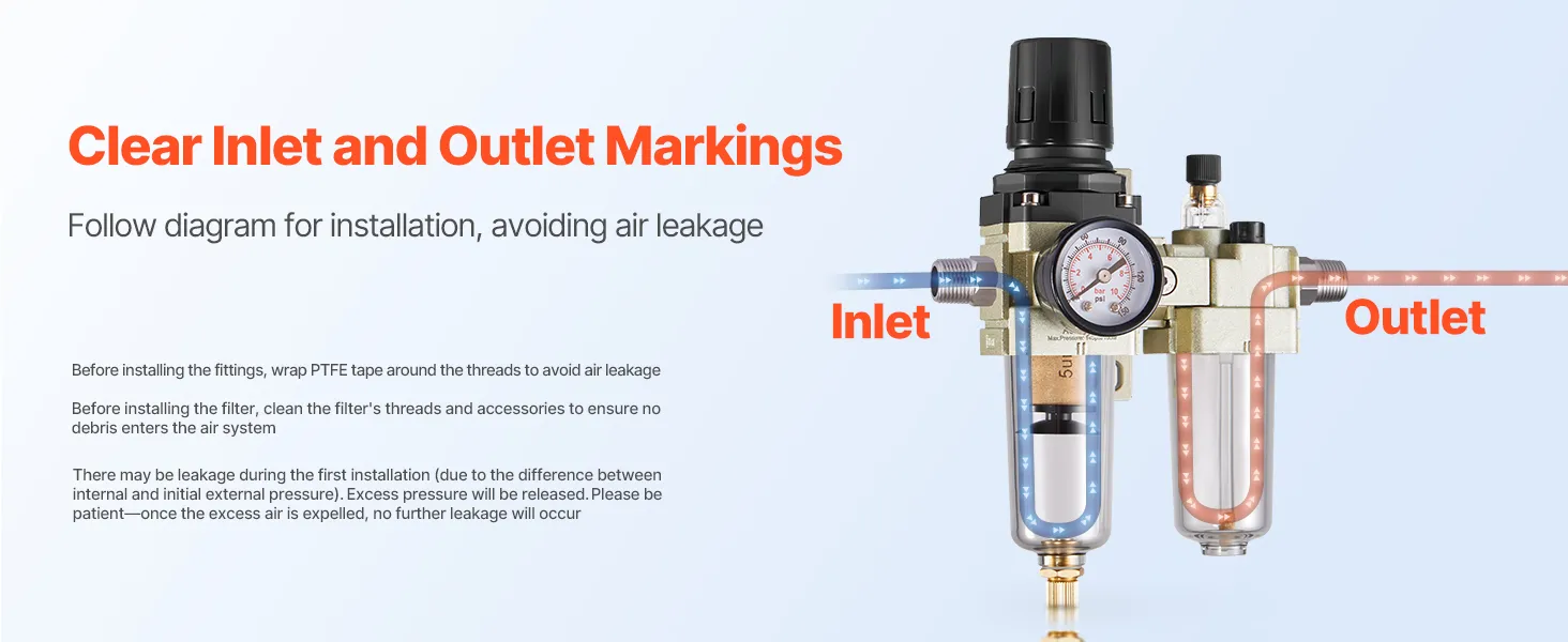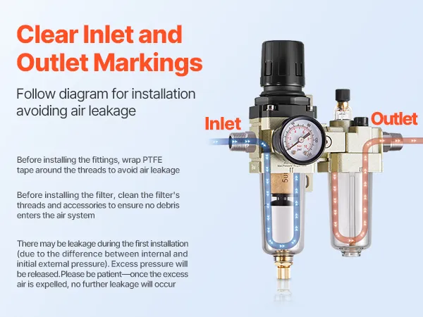 Tamaño de puerto estándar: Incluye un conector NPT de 3/8" compatible con la mayoría de los compresores de aire. Asegúrese de que la dirección del flujo de aire coincida con la flecha indicada en el producto y limpie los puertos y accesorios antes de la instalación para evitar la entrada de polvo.