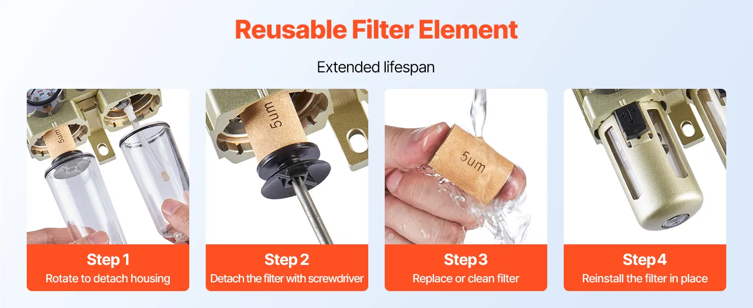 El filtro micrométrico no solo ofrece un excelente rendimiento de filtración, sino que también es extraíble. Puede limpiarlo periódicamente para eliminar las partículas acumuladas, garantizando así una filtración duradera.