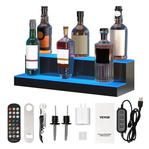 VEVOR Exhibidor de botellas de licor con luz LED, 2 niveles de 24 pulgadas, compatible con USB, estante de barra iluminado para el hogar con control remoto RF y control de aplicación, 7 colores estáticos, s