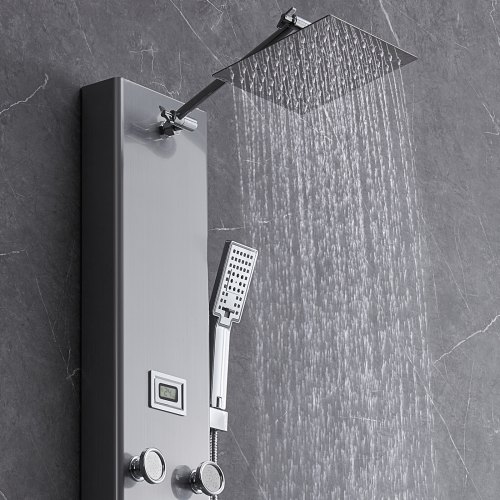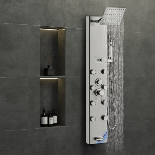 Sistema de ducha VEVOR con 5 modos de ducha, panel de ducha con pantalla digital, efecto lluvia, 8 chorros de masaje, caño de bañera, cabezal de ducha de mano con 3 posiciones y manguera de 140 cm, juego de ducha de pared de acero inoxidable.