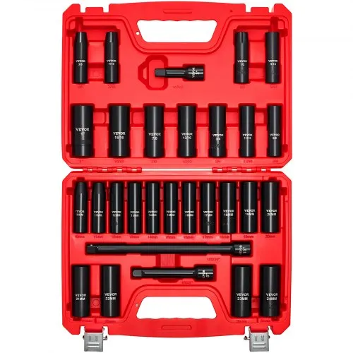 Juego de dados de impacto VEVOR de 1/2 pulg., 29 piezas, dados de impacto profundos de 6 puntas, tamaños SAE (3/8 a 1 pulg.) y métricos (10 a 24 mm) con barras de extensión (3, 5, 10 pulg.), acero Cr-V, estuche de transporte resistente.