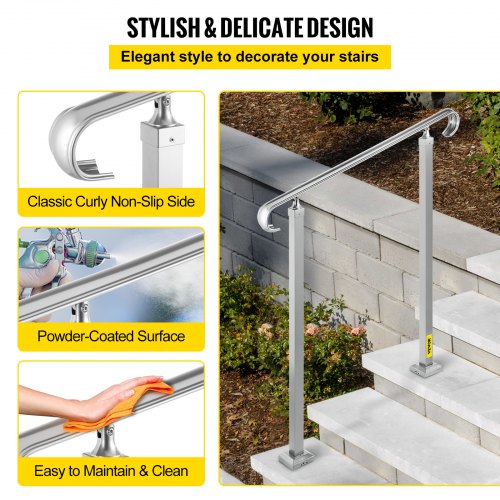 VEVOR - Barandilla de escalera para exterior, de aleación de metal, flexible, para 1 o 2 escalones, con kit de instalación, para escaleras de hormigón o madera, color plateado