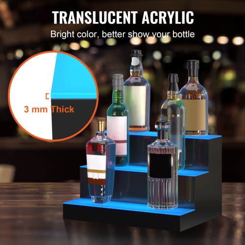 Exhibidor de botellas de licor con iluminación LED VEVOR, estante comercial iluminado de 3 niveles y 24 pulgadas para bar en casa, soporte para whisky de 3 escalones, estantes acrílicos para bebidas con control remoto RF y aplicación, e iluminación multicolor.