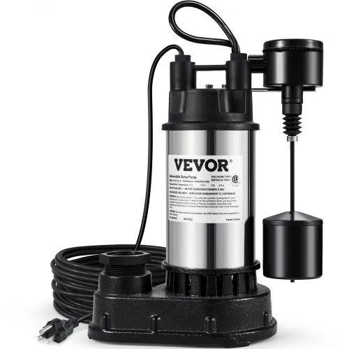 Bomba de sumidero sumergible VEVOR de 1.5 HP de hierro fundido y acero, 6000 GPH con interruptor de flotador vertical integrado, para sótanos y zonas inundables. Probada según las normas UL.