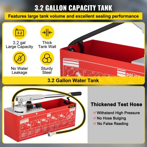 Bomba de prueba de presión hidrostática VEVOR, prueba hasta 60 bar/860 psi, tanque de 3,2 galones, kit de comprobador de presión de agua manual hidráulico con manómetro de tres unidades y conexión R de 1/2" para prueba de presión de fluidos en tuberías.