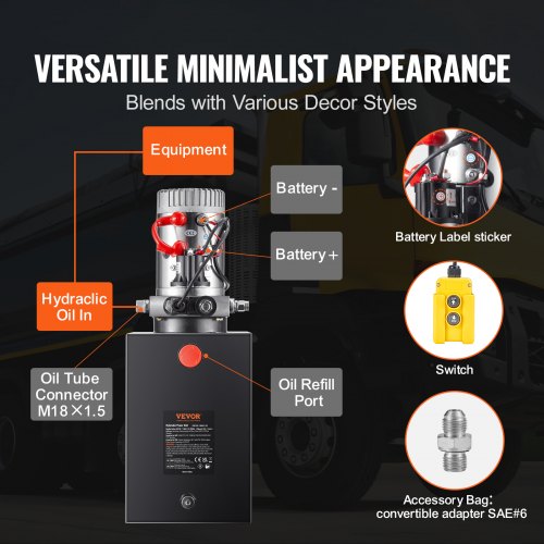 Bomba hidráulica VEVOR de 12 cuartos de galón, de simple efecto, para remolques de volteo, caudal de 0,91 GPM, presión máxima de alivio de 3200 PSI, 12 V CC para elevación de vehículos con remolques de volteo.