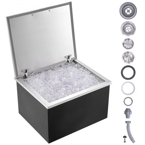 Hielera empotrable VEVOR de acero inoxidable de 56 cm de largo x 43 cm de ancho x 30 cm de alto. Contenedor de hielo comercial con tapa, barra de hielo para cocina al aire libre de 40 cuartos de galón. Incluye tubo y tapón de drenaje. Ideal para vino y cerveza fríos.