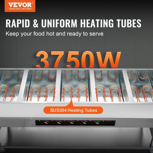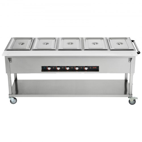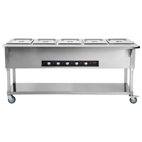Calentador de alimentos comercial VEVOR de 5 bandejas, mesa de vapor eléctrica de 5 x 20.6 cuartos, 3750 W, calentador de alimentos profesional para bufés y catering con 4 ruedas (2 con freno), servidor de acero inoxidable de grado alimenticio para restaurantes y fiestas.