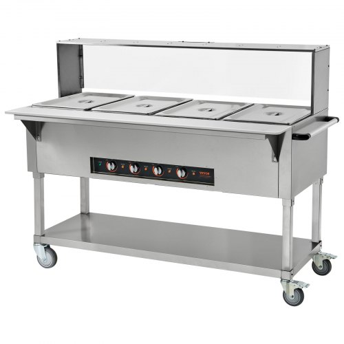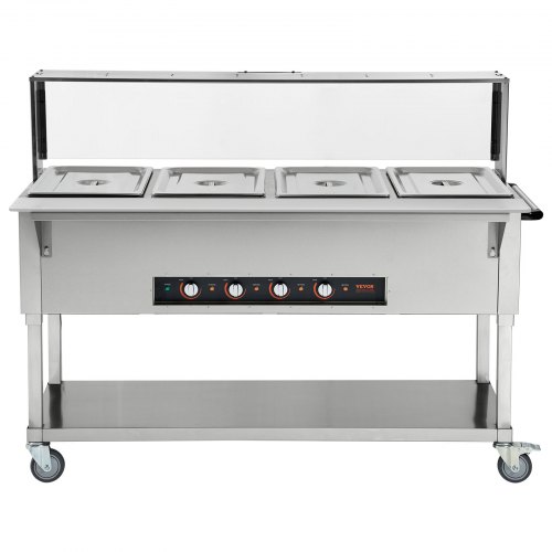 Calentador de alimentos comercial VEVOR de 4 bandejas, mesa de vapor eléctrica de 4 x 20.6 cuartos, calentador de alimentos profesional para bufés y catering de 2000 W con protector contra estornudos de acrílico, servidor de acero inoxidable de grado alimenticio para restaurantes y fiestas.