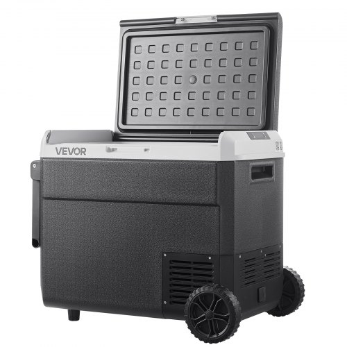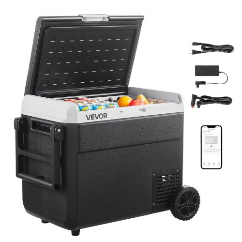 Refrigerador para coche VEVOR de 12 voltios, 63,4 cuartos de galón/60 litros, portátil, con ruedas y asa, de -20 °C a 20 °C, 12/24 V CC y 100-240 V CA, con compresor, ideal para exteriores, camping, viajes y autocaravanas.