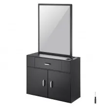 Organizador de salón VEVOR, mueble de pared para peluquería, con 3 soportes, espejo, dos puertas y un cajón, color negro.