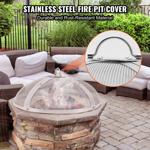 Tapa protectora contra chispas VEVOR para fogatas de 76 cm de diámetro, accesorio redondo para fogatas de exterior, cubierta metálica para fogatas, cubierta de acero inoxidable de fácil apertura para fogatas de patio y jardín.