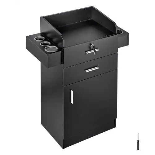 VEVOR Estación Negra de Salón de Peluquería para Estilista, Juego de Estación de Estilista con 6 Mangas, 1 Gabinete de Almacenamiento y 2 Cajones, 1 con Cerradura, para Salón, Spa, Peluquería