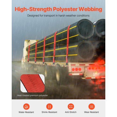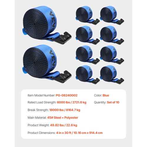 Correas de cabrestante VEVOR, 10 cm x 9 m, capacidad de carga de 2777 kg, resistencia a la rotura de 8277 kg, correas para camión con gancho plano, amarres para plataforma, control de carga para remolques, granjas, rescates, protección de árboles, color rojo (paquete de 10)