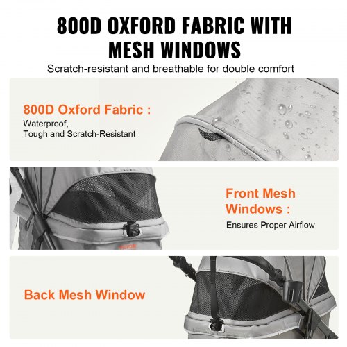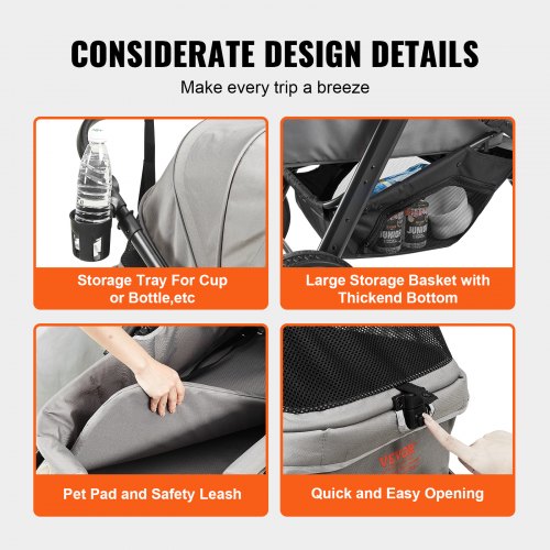 Cochecito para mascotas VEVOR, 3 ruedas de PU, giratorio con frenos, capacidad de peso de 34 kg, con almohadilla para mascotas, cesta de almacenamiento y portavasos externo, para perros pequeños y medianos, gris