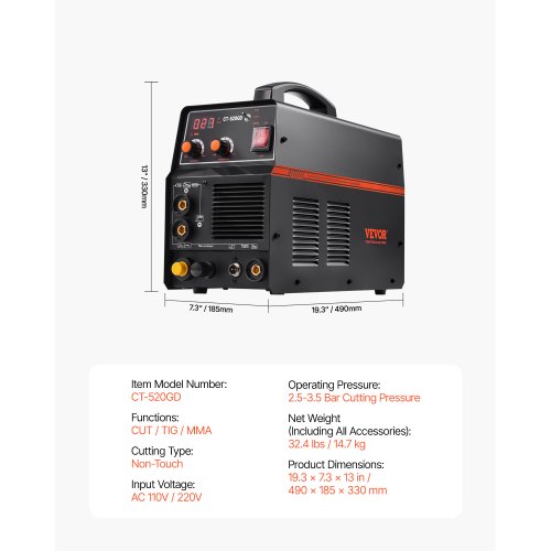 Máquina soldadora de plasma 3 en 1 VEVOR, CT-520GD, máquina combinada de plasma TIG/MMA, arco piloto sin contacto de 30 A, soldadora TIG y de varilla de 200 A, inversor IGBT digital de doble voltaje de 110/220 V