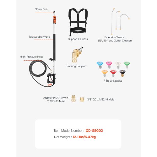 Varilla telescópica para hidrolavadora VEVOR, 21 pies, 4000 psi, varilla rociadora telescópica con varillas de extensión para hidrolavadora, limpiador de canaletas, cabezal de cepillo, acoplador pivotante, 7 boquillas rociadoras y arnés de soporte