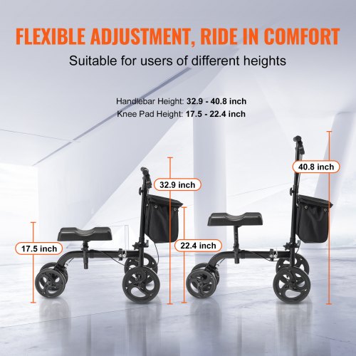 Patinete de rodilla plegable VEVOR, andador de rodillas dirigible de acero al carbono con manillar y rodillera ajustables en altura, ruedas sólidas todoterreno, frenos dobles, patinete de recuperación para lesiones de tobillo y pie.