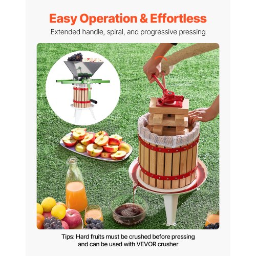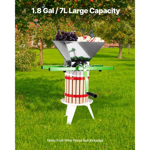 VEVOR Triturador de frutas y manzanas de 7 l (1,8 galones), triturador manual grande, de acero inoxidable, para prensar vino, sidra, manzanas y uvas, con mango de rodillo para cocina y hogar, color verde