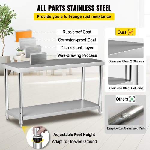 VEVOR Mesa de preparación de acero inoxidable, mesa comercial de acero inoxidable de 60 x 14 x 33 pulgadas, 2 mesas de preparación para barbacoa con estante inferior ajustable, mesa de trabajo de coci