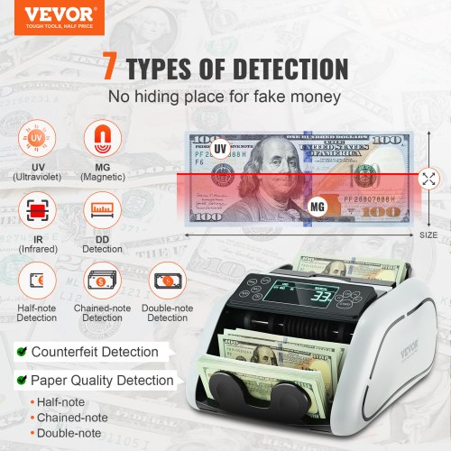 Contadora de billetes VEVOR, con detección de billetes falsos mediante UV, MG, IR y DD, para USD y EUR, con pantalla LCD grande y pantalla externa para pequeñas empresas.