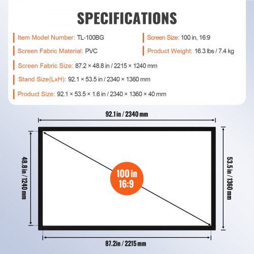 Pantalla de proyector VEVOR de 100 pulgadas con marco fijo, diagonal 16:9, 4K, HD, con marco de aluminio, para cine en casa, oficina y montaje en pared.