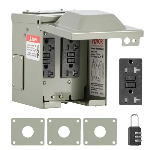 Panel de tomacorrientes temporal VEVOR de 20, 30 y 50 A para vehículos recreativos y vehículos eléctricos, con tomacorriente NEMA de 50 A, NEMA de 30 A, GFCI de 20 A instalado, caja impermeable IP54 precableada, para autocaravanas, caravanas y autocaravanas.