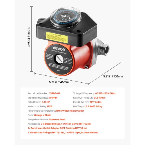 Bomba de recirculación de agua caliente VEVOR con válvula de derivación, kit de bomba de recirculación instantánea con temporizador, adaptador, sistema de circulación, cabezal de acero inoxidable, 0,13 HP, 110-120 V, para calentadores de agua de tanque.