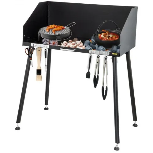 VEVOR Mesa de Cocina de Acero al Carbono 38 x 16 Pulgadas con Parabrisas de Tres Caras y Patas para Preparar Comida al Aire Libre y Horno Holandés