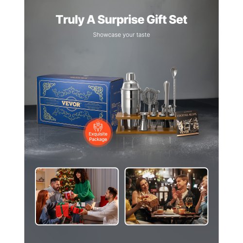 Juego de coctelera VEVOR, 13 piezas de acero inoxidable con soporte de bambú, accesorios para barman de Martini | Cuchara mezcladora, mortero, medidor, colador, vertedor de licor, pinza para hielo, sacacorchos, plateado