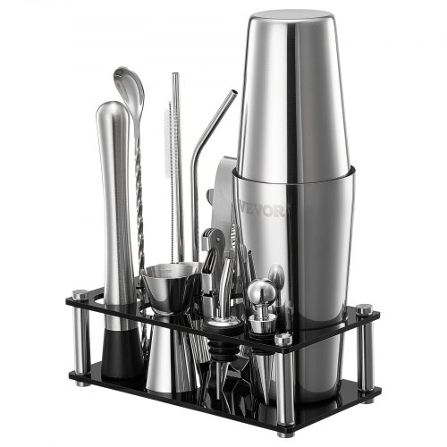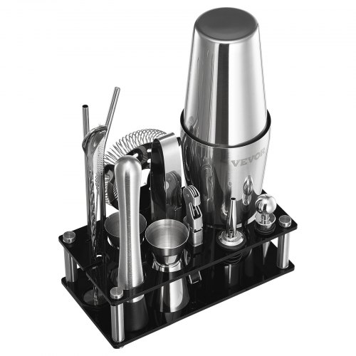 Juego de coctelera VEVOR, 14 piezas de acero inoxidable con soporte acrílico, accesorios para el kit de barman Boston | Cuchara mezcladora, mortero, medidores, colador, vertedor de licor, pinza para hielo, sacacorchos, plateado
