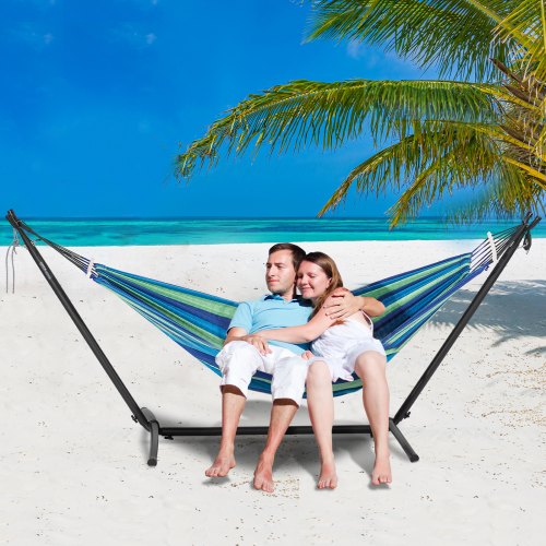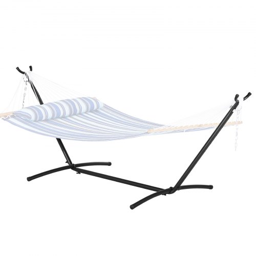 Soporte portátil para hamaca VEVOR, capacidad de 204 kg, de acero, para 2 personas, con ganchos ajustables de alta resistencia. Estructura compatible con hamacas de 3 a 4 m. Ahorra espacio e incluye bolsa de transporte para uso en interiores o exteriores.