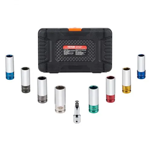 VEVOR Kit de Dados de Impacto para Tuercas de Rueda con Estuche de Almacenamiento y Barra de Extensión Kit de dados Profundos SAE de 6 Puntas y Métricos con Impulsión de 12,7 mm, 8 tamaños de tuercas