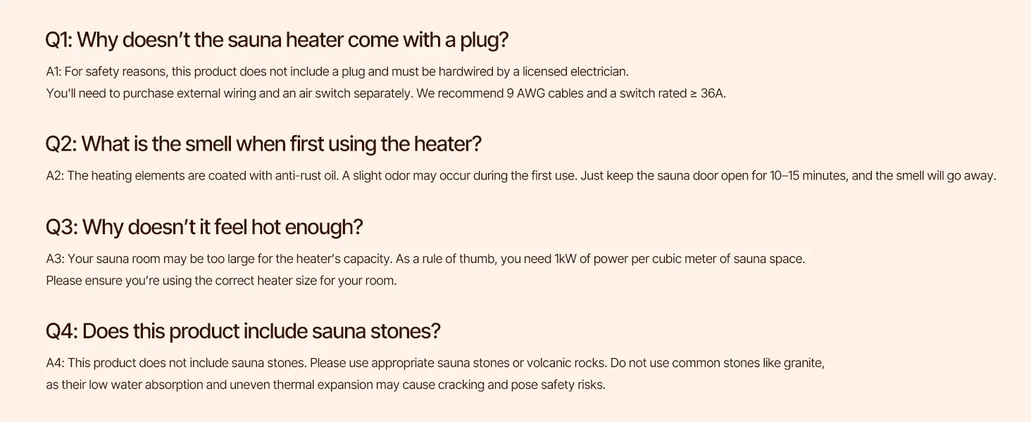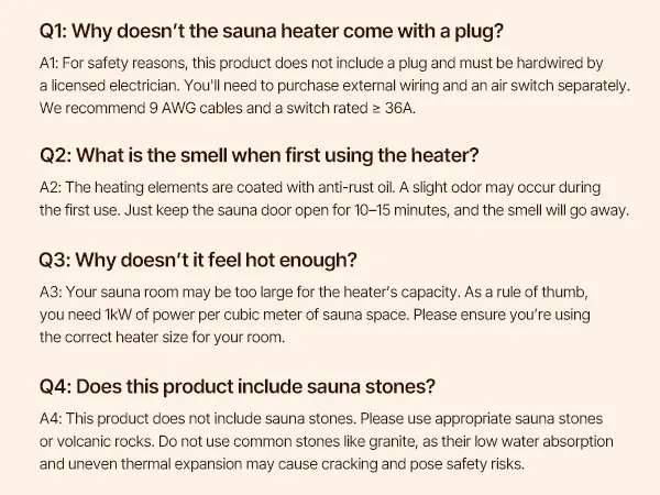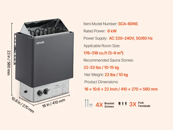 Calentamiento rápido: Potencia: 6KW; Sala de sauna adecuada: 176-318 pies cúbicos / 5-9 m³; Dimensiones: 16,1'' x 10,6'' x 22''. Necesidad de piedras para sauna: 33 lbs / 15 kg. Nota: Las piedras de sauna NO ESTÁN INCLUIDAS. La amplia capacidad de las piedras permite que las piedras absorban y almacenen calor, asegurando una retención y dispersión efectiva del calor.