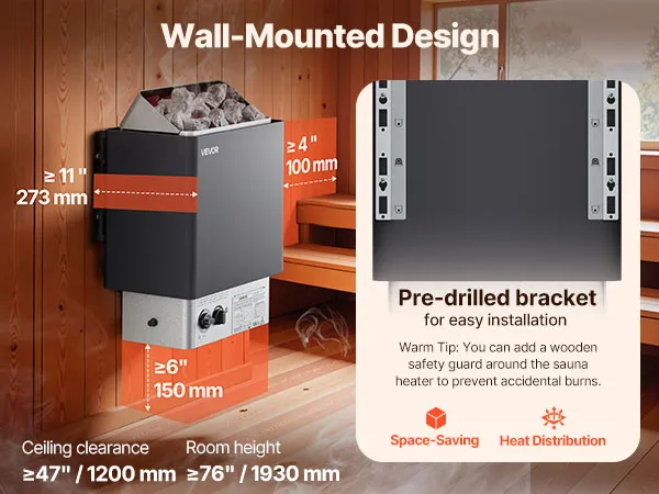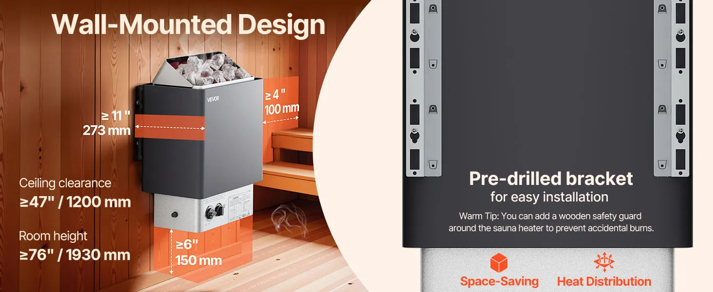 Diseño de montaje en pared: Experimente una instalación sin esfuerzo con nuestro calentador de sauna de vapor, que cuenta con un soporte preperforado completo con tensores reservados. Simplemente asegure el calentador usando esta configuración que ahorra mano de obra. Para una disipación de calor óptima y mayor seguridad, recomendamos instalar el calentador a una altura de 3,5 pulgadas del piso. Esto no sólo garantiza un uso seguro sino que también ayuda a ahorrar un valioso espacio en el suelo.