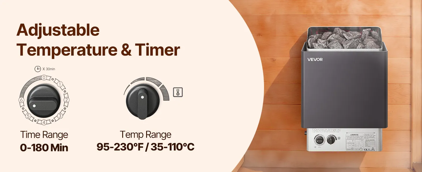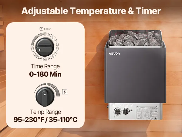 Ajuste la temperatura y el tiempo: el calentador de sauna doméstico cuenta con perillas mecánicas fáciles de usar para controlar la temperatura y el tiempo, lo que le brinda la flexibilidad de personalizar su experiencia de sauna según su comodidad. Con una temperatura máxima de 230 ℉ y una capacidad de sincronización de hasta 3 horas, tienes control total sobre tu sesión de sauna.