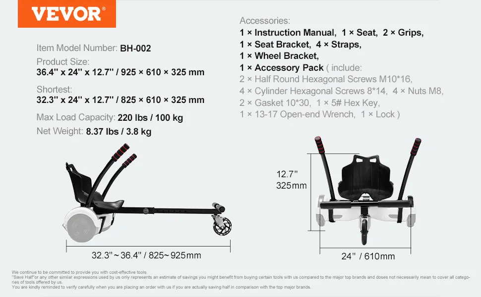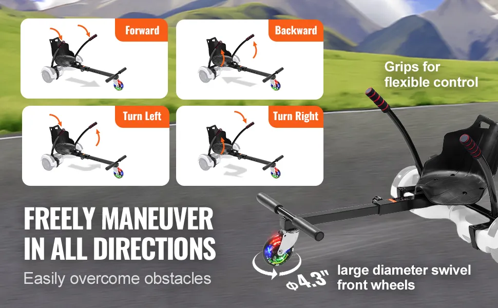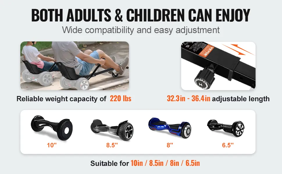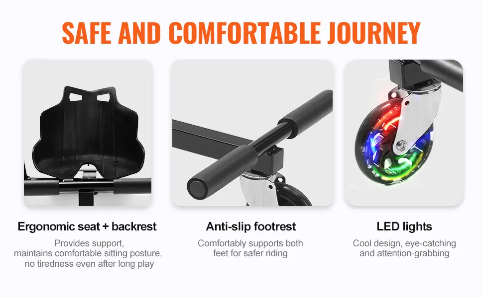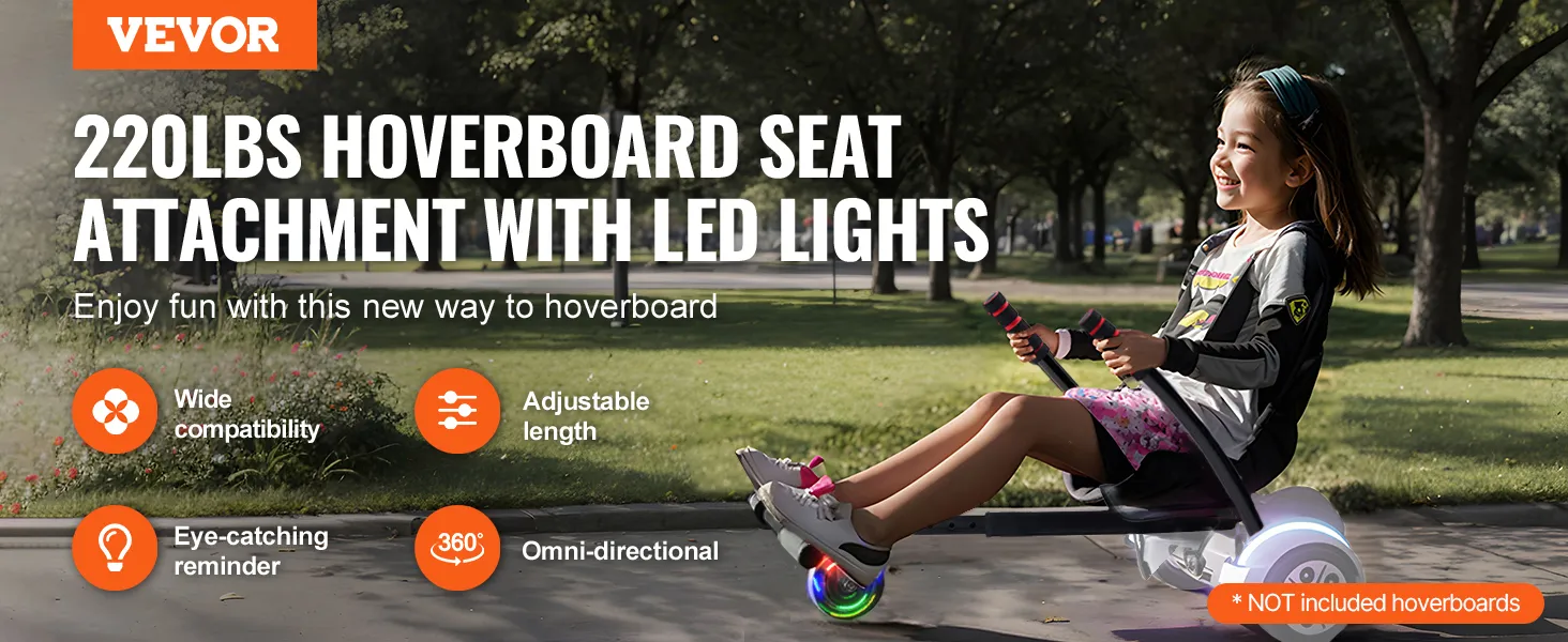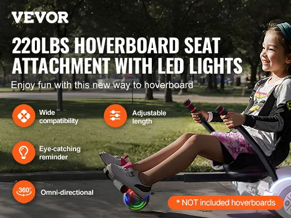 Accesorio de asiento VEVOR para hoverboard, compatible con hoverboards de 6.5", 8", 8.5" y 10", con luces LED, controles en el manillar, longitud de marco ajustable y capacidad de carga de 220 libras. Ideal para hoverboards y karts, para niños y adultos.