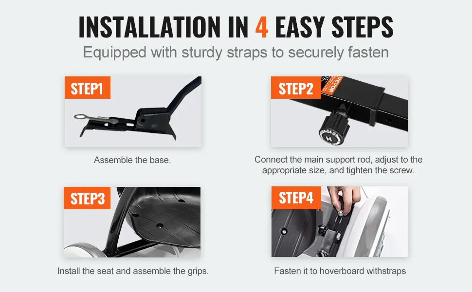 Incluye un manual de instalación completo y detallado. Te proporcionamos llaves inglesas, correas y otros accesorios para que puedas instalar fácilmente el asiento del hoverboard sin necesidad de procedimientos complicados ni herramientas adicionales. Prepárate para mejorar tu experiencia de conducción al instante.