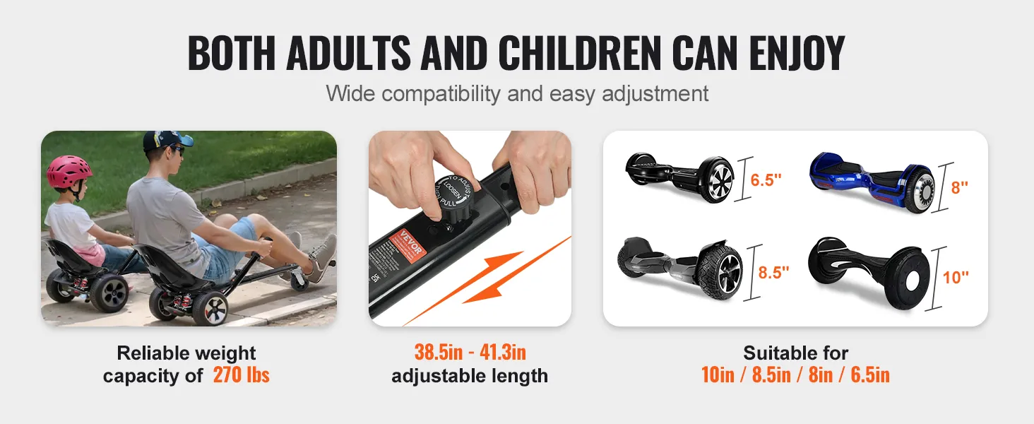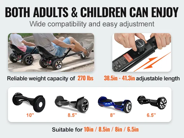Compatible con patinetes autoequilibrados de 10/8,5/8/6,5 pulgadas disponibles en el mercado, lo que elimina las preocupaciones sobre la compatibilidad. Longitud ajustable de 38,5 a 41,3 pulgadas, lo que proporciona una gran capacidad de carga de 270 libras, lo que garantiza experiencias seguras y libres.