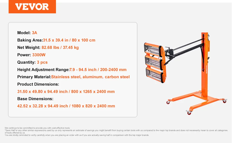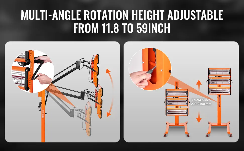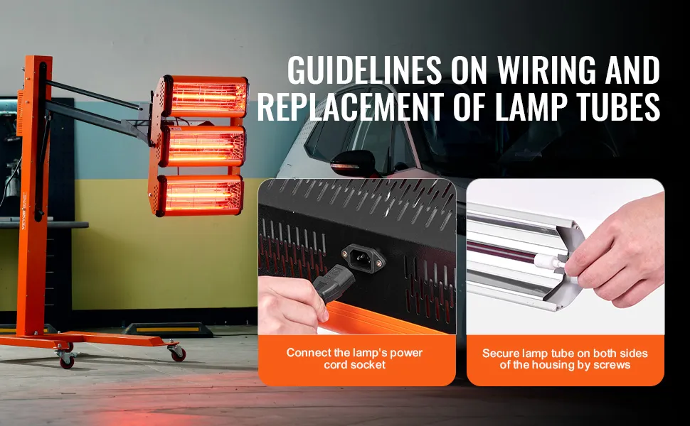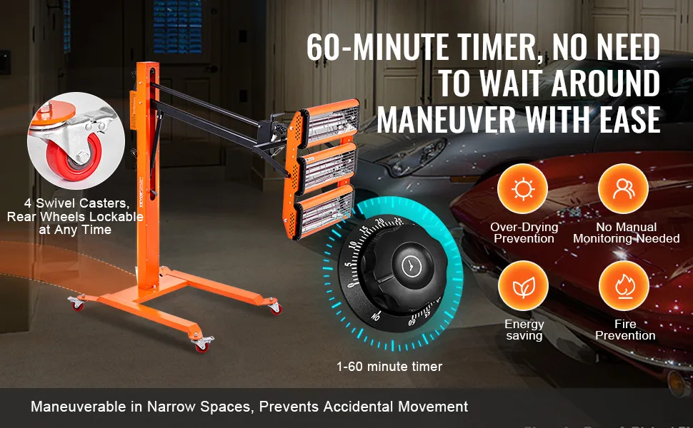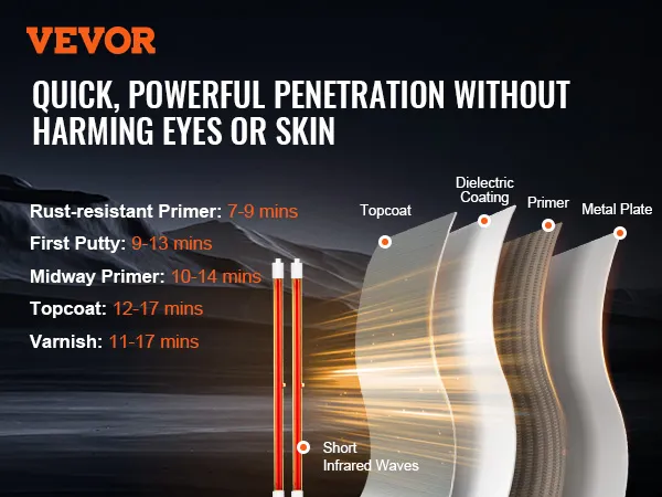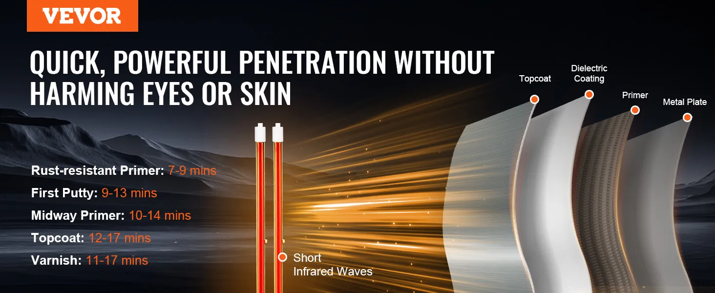Secado rápido en 4 minutos: Este secador de pintura de tres cabezales de 3300 W seca la imprimación rápidamente en tan solo 4 minutos, cubriendo un área de 8,61 pies cuadrados (0,8 m²). La luz infrarroja de onda corta proporciona una alta penetración y el tubo de cuarzo realza el brillo. Está diseñado para usuarios que buscan resultados de pintura eficientes, rápidos y de alta calidad.