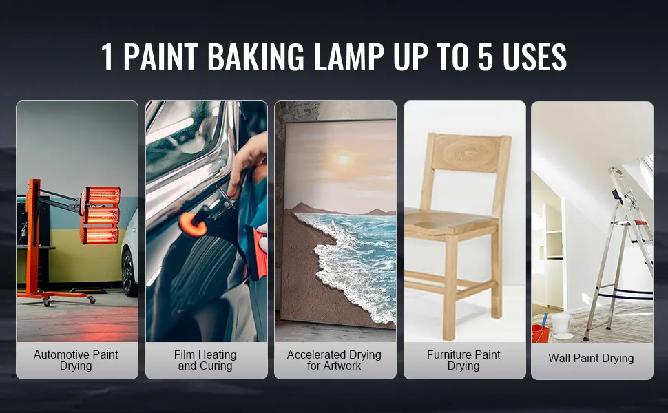Esta lámpara secadora de pintura es ideal para secar coches, muebles y cuadros. Ofrece un secado rápido, seguridad y durabilidad. Equipada con diversas funciones prácticas, es fácil de usar y la opción ideal para todas sus necesidades de secado.