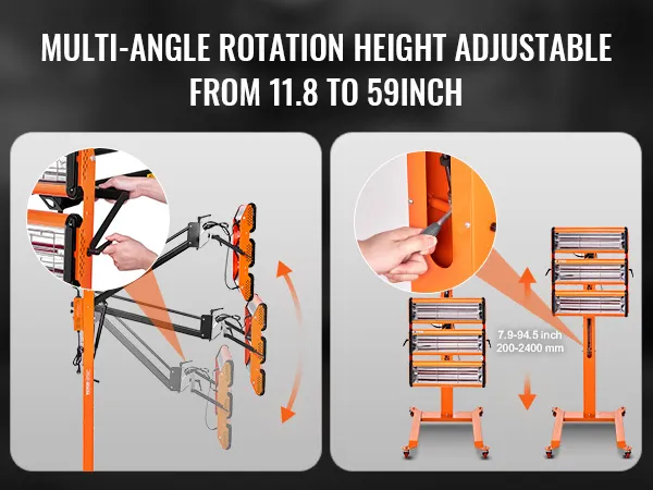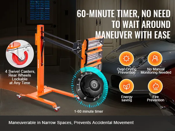Elevator hidráulico: This secador de paint cuenta with an intelligent temporizador de 60 minutes and three interruptors independent for each lamp. Ofrece anggulos de cabezal de lámpara adjustables y altura de elevación hidráulica, además de ruedas omnidirectionales ruedas bloqueables, lo que facilita la synchronization, the adjustment of the cabezal de la lámpara y la movilidad durante el processo de paint para una Experiencia de trabajo more efficient.