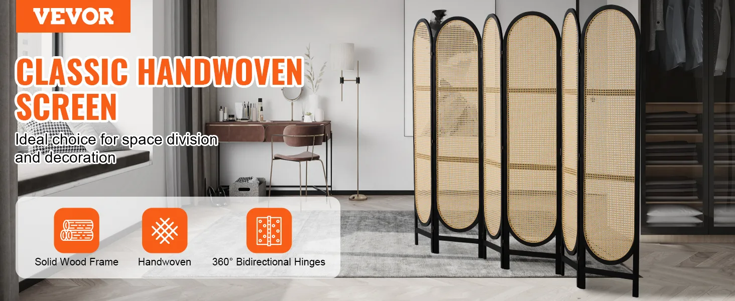Este divisor de ambientes cuenta con un marco de madera maciza y está tejido a mano con tiras de ratán, lo que ofrece una combinación perfecta de privacidad y atractivo decorativo, agregando un toque de estilo vintage y moda a su hogar.