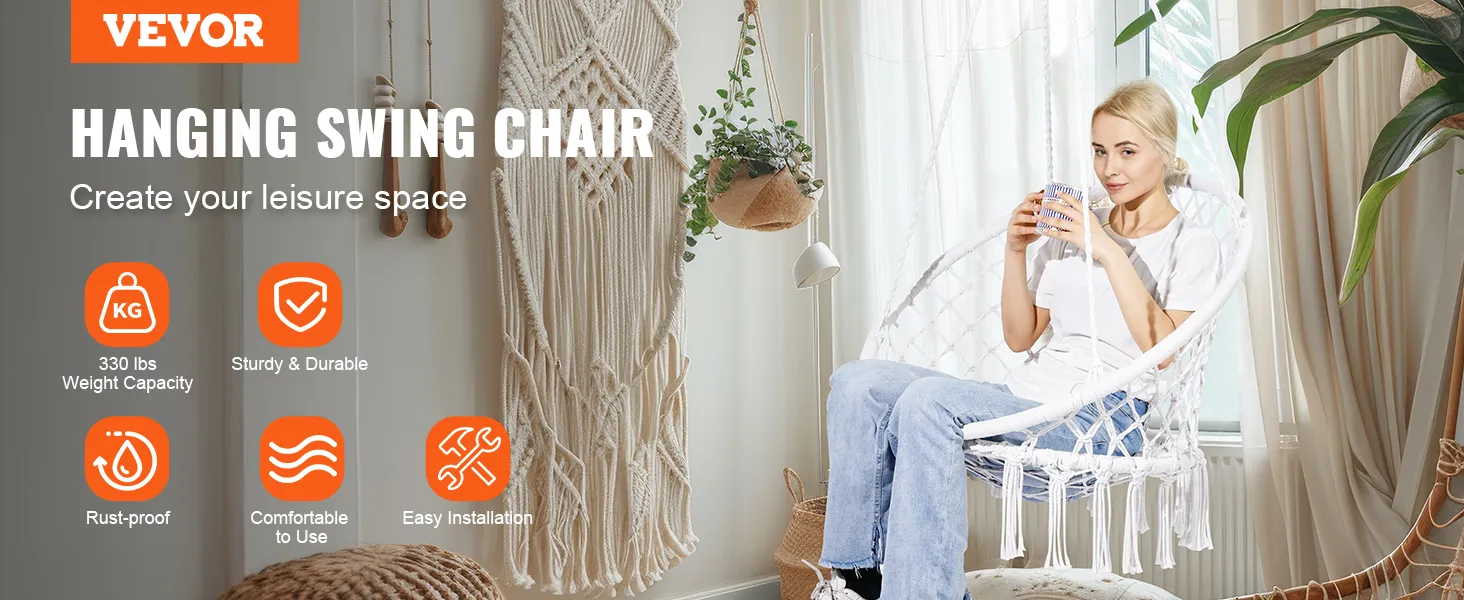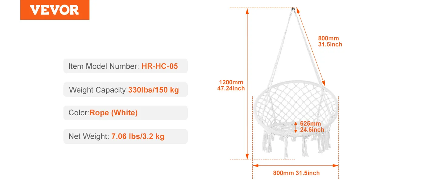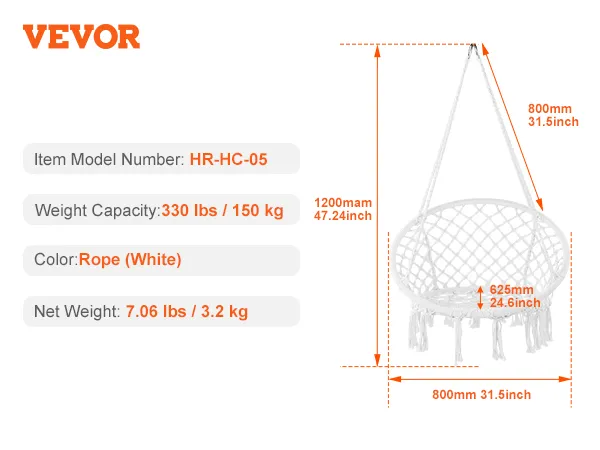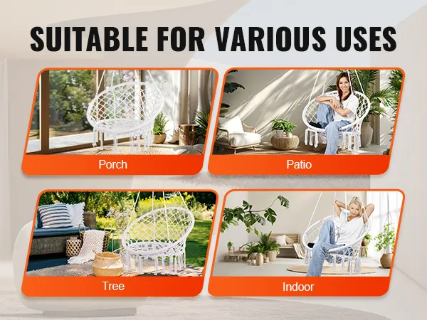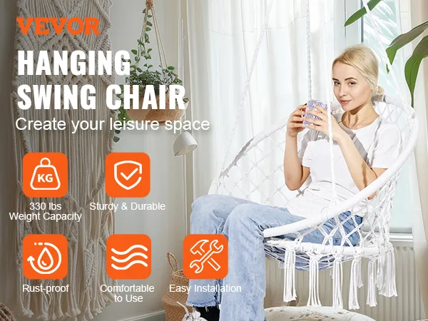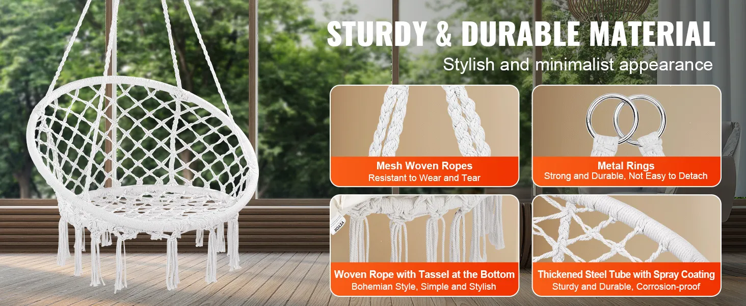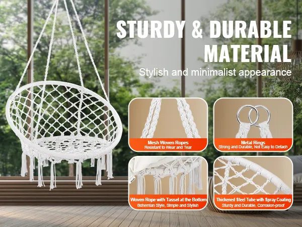 Material estable: nuestra hamaca colgante cuenta con un marco de tubo de acero reforzado combinado con cuerdas de malla tejida para una sujeción segura. Este diseño robusto garantiza la estabilidad, con una capacidad de peso de hasta 330 libras, lo que la hace adecuada para la mayoría de los adultos.