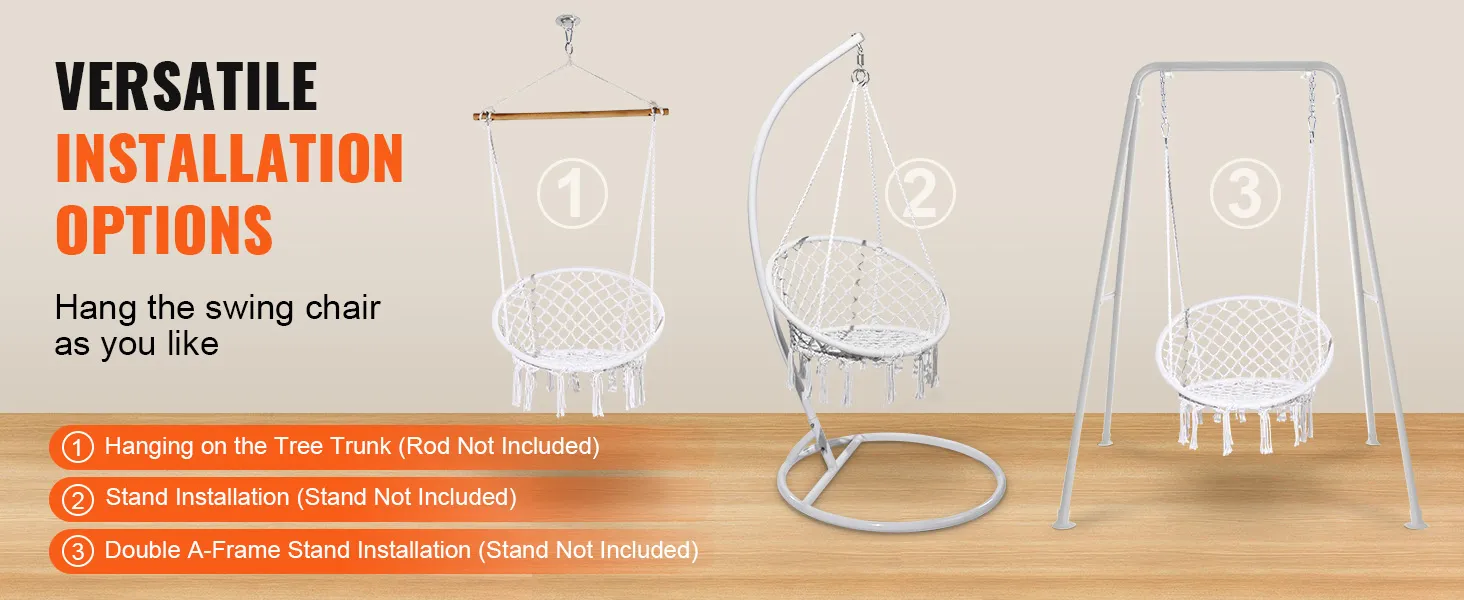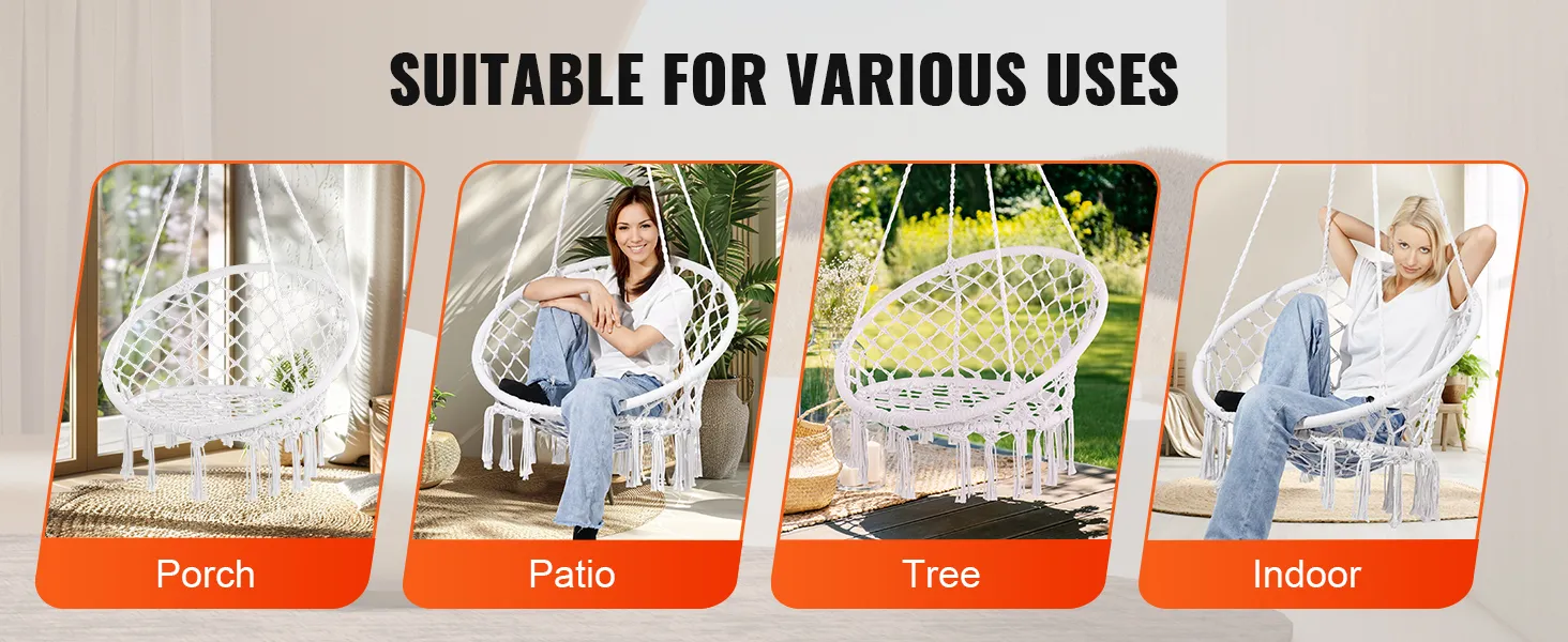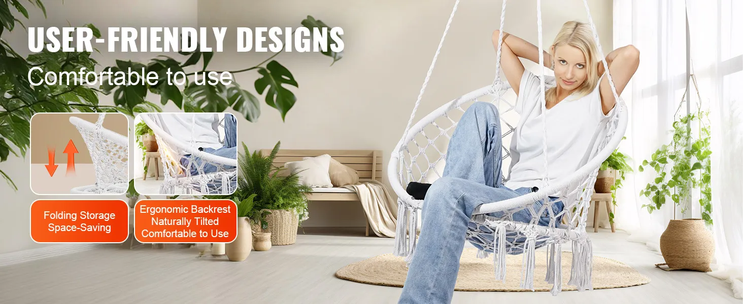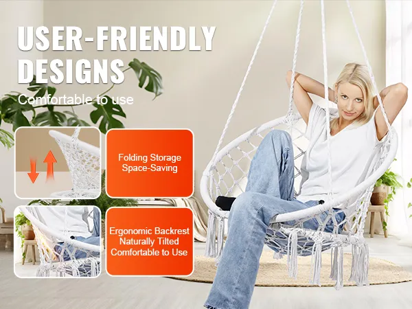Uso cómodo: el respaldo del asiento está inclinado de forma natural y tiene un diseño ergonómico que te permite relajarte y descansar cómodamente. Después de su uso, la hamaca de macramé se puede plegar para guardarla de forma compacta. Este diseño cuidadoso garantiza una experiencia cómoda.