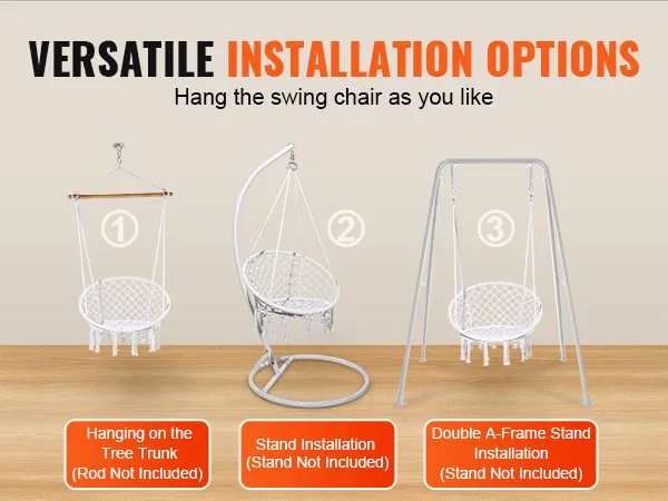 Fácil instalación: utiliza los accesorios incluidos para instalar fácilmente la hamaca colgante en el techo, un árbol, un soporte para hamaca o cualquier viga resistente. Ten en cuenta que los diferentes métodos de instalación pueden requerir accesorios adicionales, que no están incluidos.