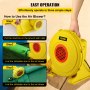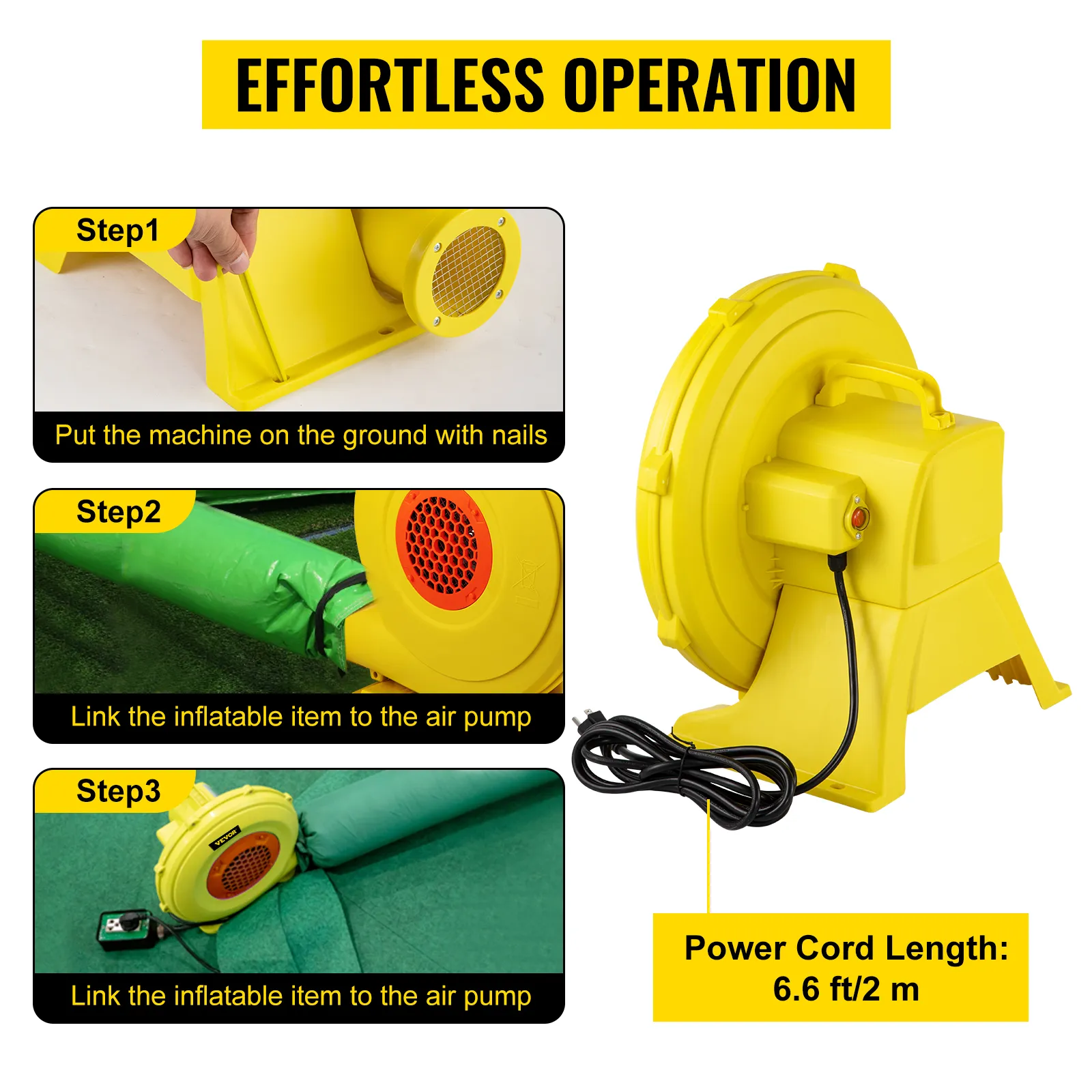 Nuestro soplador de aire para inflables se puede instalar en minutos. Primero, coloque la máquina en el suelo con clavos, luego conecte los artículos inflables necesarios a la bomba de aire. Por último, conecte la alimentación y encienda el interruptor para comenzar a soplar. Longitud del cable: 6,6 pies/2 m.